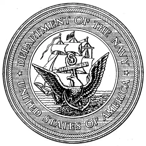 On a circular background of fair sky and moderate sea with land in sinister base, a three-masted square-rigged ship under way before a fair breeze with after topsail furled, commission pennant atop the foremast, National Ensign atop the main, and the commodore's flag atop the mizzen. In front of the ship a Luce-type anchor inclined slightly bendwise with the crown resting on the land and, in front of the shank and in back of the dexter fluke, an American bald eagle rising to sinister regarding to dexter, one foot on the ground, the other resting on the anchor near the shank; all in proper colors. The whole within a blue annulet bearing the inscription "DEPARTMENT OF THE NAVY" at the top and "UNITED STATES OF AMERICA" at the bottom, separated on each side by a mullet and within a rim in the form of a rope; inscription, rope, mullet, and edges of annulet all gold;