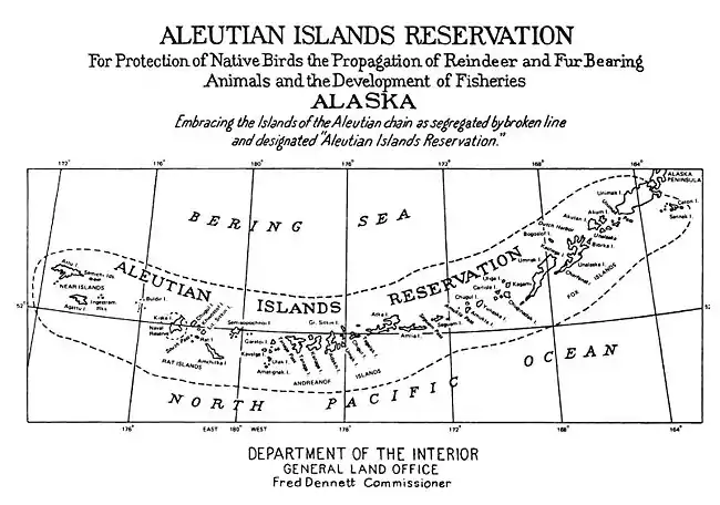 It is hereby ordered that all islands of the Aleutian chain, Alaska, including Unimak and Sannak Islands on the east, and extending to and including Attu Island on the west, be, and the same are hereby, reserved and set apart as a preserve and breeding ground for native birds, for the propagation of reindeer and fur-bearing animals, and for the encouragement and development of the fisheries. Jurisdiction over the wild birds and game and the propagation of reindeer and fur-bearing animals is hereby placed with the Department of Agriculture, and jurisdiction over the fisheries, seals, sea otter, cetaceans, and other aquatic species is placed with the Department of Commerce and Labor.