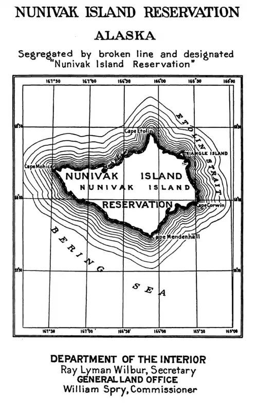 It is hereby ordered that Nunivak Island, west of Etolin Strait, off the coast of Alaska, located approximately in latitude 60° north, longitude 166° west from Greenwich, in Bering Sea, and located within the area segregated by the broken line upon the diagram hereto attached and made a part of this order, be and the same is hereby reserved from settlement, location, sale, or entry, and from classification and lease under the provisions of the Act approved March 4, 1927 (44 Stat. 1452), entitled "An Act to provide for the protection, development, and utilization of public lands in Alaska by establishing an adequate system of grazing livestock thereon," and set apart for the use of the Department of Agriculture in conducting experiments in the crossing and propagation of reindeer and native caribou, for contemplated experiments in reestablishing the musk ox as a native animal of Alaska, and also as a preserve and breeding ground for native birds and wild game and fur-bearing animals for carrying out the purposes of the Alaska game law of January 13, 1925 (43 Stat. 739, U. S. C., Title 48).