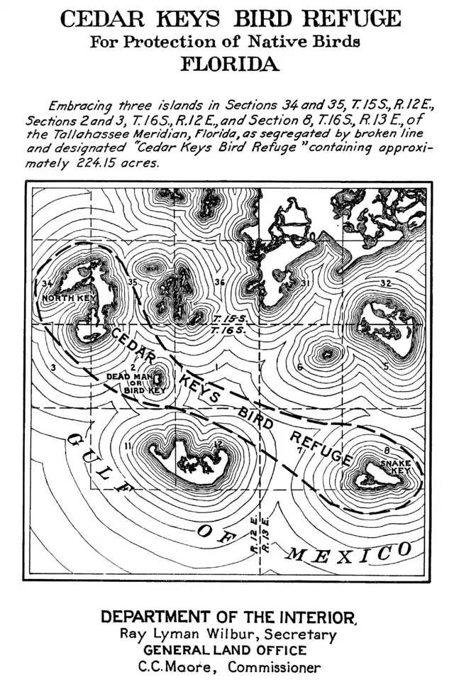 It is hereby ordered that Snake, Dead Man or Bird, and North Keys, situated in the island group known as Cedar Keys, on the west coast of Florida in Townships 15 and 16 South, Range 12 East, and Township 16 South, Range 13 East, Tallahasse Meridian, within the boundary indicated by the broken line upon the diagram hereto attached and forming a part of this order be and the same are hereby, reserved and set apart for the use of the Department of Agriculture as a refuge and breeding ground for birds, subject to existing valid rights.