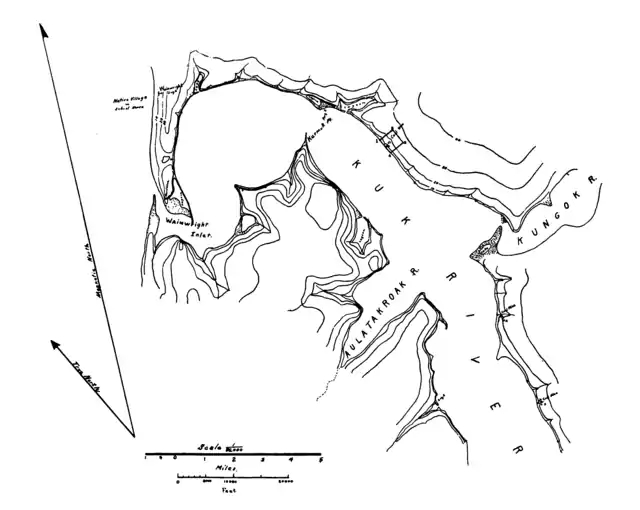 | Beginning at Post No. 1, at a point on the eastern shore of Kuk River approximately 8,000 feet southeast of the entrance to the lagoon whose entrance is 8,000 feet east of Karmuk Point; thence easterly 3,000 feet to Post No. 2; thence southerly 3,000 feet to Post No. 3; thence westerly 3,000 feet to Post No. 4; thence northerly 3,000 feet along the shore of Kuk River to Post No. 1, the place of beginning, containing 206 acres, more or less. |