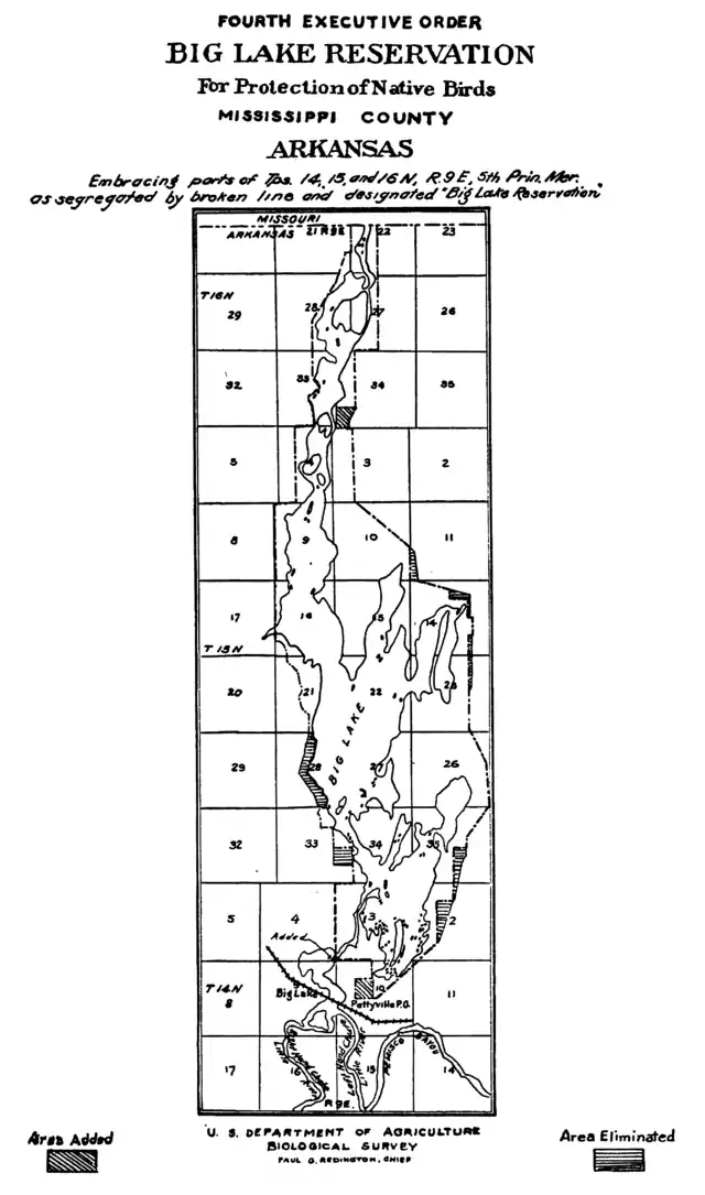 It is hereby ordered that the Big Lake Reservation, Ark., created for the protection of native birds, by Executive Order No. 2230, dated August 2, 1915, reduced by Executive Order No. 2872, dated May 31, 1918, and modified by Executive Order No. 3964, dated February 23, 1924, be, and the same is hereby, further modified as to area and boundary lines, subject to existing valid rights, so as to exclude therefrom certain parcels on which patents have issued and to include therein certain tracts lying exterior to the west boundary of drainage district number seventeen, Mississippi County, Ark.
