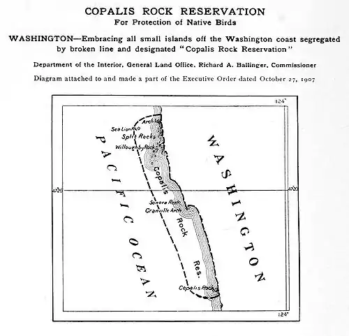 It is hereby ordered that all small, unsurveyed islands lying off the coast of the State of Washington in the Pacific Ocean, between latitudes 47° 8′ North, and 47° 29′ North, among which are those named and commonly known as Arch Island, Sea Lion Rock, Willoughby Rock, Split Rocks, Sonora Reef, Greenville Arch and Copalis Rock, as the same are shown upon coast survey chart No. 6400 or upon the General Land Office map of the State of Washington, dated 1887, and located within the area segregated by a broken line and shown upon the diagram hereto attached and made a part of this order, are hereby reserved and set aside for the use of the Department of Agriculture as a preserve and breeding ground for native birds and animals. This reservation to be known as Copalis Rock Reservation.