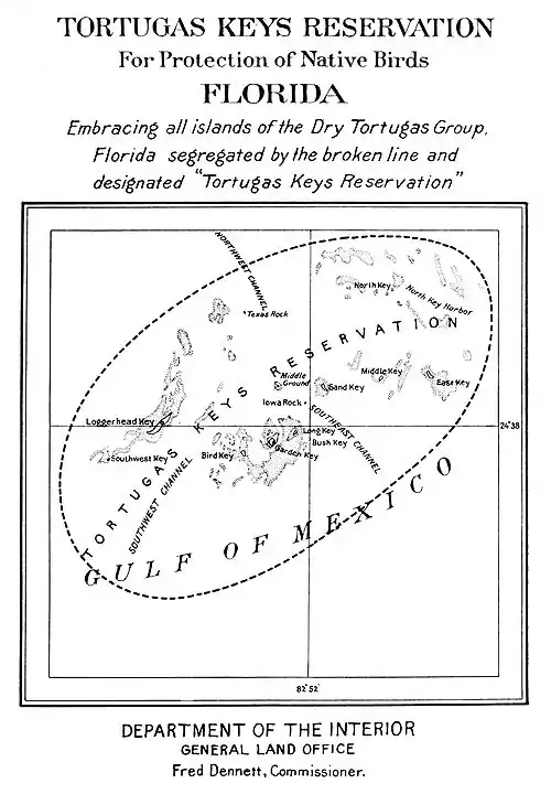 It is hereby ordered that all islands embraced within the group known as the Dry Tortugas, located in the Gulf of Mexico, near the western extremity of the Florida Keys, approximately in latitude twenty-four degrees, thirty-eight minutes north, longitude eighty-two degrees, fifty-two minutes west from Greenwich, and situated within the area segregated by a broken line upon the diagram hereto attached and made a part of this order, are hereby reserved and set aside for the use of the Department of Agriculture as a preserve and breeding-ground for native birds; but the reservation made by this order is not intended to interfere with the use of these islands for necessary military purposes under the Executive Order of September 17, 1845, creating the Dry Tortugas Military Reservation, nor to, in any manner, vacate such order, except that such military use shall not extend to the occupation of the islet known as Bird Key. This reservation to be known as Tortugas Keys Reservation.