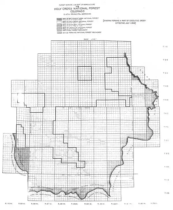 It is hereby ordered that on and after July 1, 1908, the land within the boundaries shown on the attached diagram, heretofore set apart, reserved, and proclaimed as parts of the Holy Cross, Leadville, Gunnison, and Battlement Mesa National Forests, shall be known as the Holy Cross National Forest. The remaining portions of the Holy Cross National Forest shall continue reserved and constitute parts of the Leadville National Forest. It is not intended by this order to release any land from reservation or to reserve any land not heretofore embraced as a National Forest.