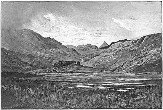 In the warm sunshine of a day in June we sat on a bank above the dark pool beneath whose eddying waters some of the arms perhaps still lie. There was a gentle breeze, the larks were singing over our heads, the water was sparkling and splashing, the sides of the torrent were overhung with the mountain ash and were green with ferns, but below us and in front lay a scene of wild desolation. Far off to the west was the mountain which Boswell had pointed out to Johnson as being like a cone. "No, Sir," said Johnson.