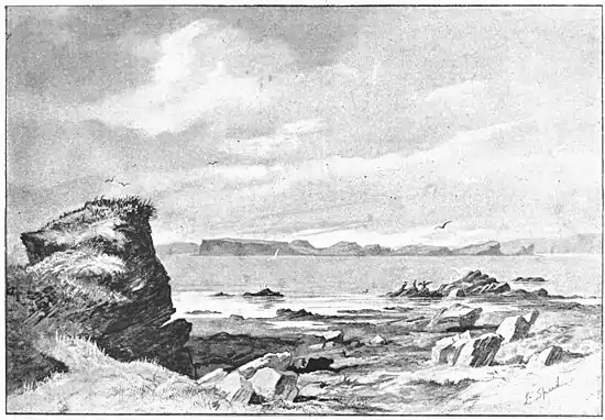 heath to a fine breezy headland. Below us another stretch of heath-land sloped down to the shore of the loch. On the other side of a narrow channel lay Isa, with fine rocky cliffs to the west and the north, but lying open to the south-east. It was Midsummer Day. The sea was calm, a blue haze softened the outline of the neighbouring hills, but let the mountains in the farther Hebrides be but faintly seen. The little isle lay before us with no signs on it of human habitation. Buchanan describes it as "fertilis frugum,"[13] and Martin says that it was "fruitful in corn;"[14] but it must be many a year since the plough turned up its soil. It is a land of pastures. In the hot, drowsy air there was nothing but the song of the lark and the bleating of the lambs "to break the silence of the seas." Far below us a shepherd with his two dogs was gathering a small flock of sheep. They, and the larks, and the sea-birds were the only things that seemed alive. We had reached, as it were, the antipodes of "that full tide of human existence" in which Johnson delighted. For