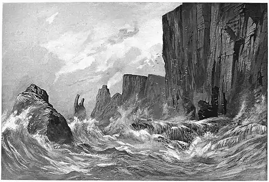 "It has in front a fine series of genuine basaltic columns, resembling the Giant's Causeway. The ruins of the columns at the base made a grand appearance; they were the ruins of the creation. This is the most northern basalt I am acquainted with; the last of four, all running from south to north—the Giant's Causeway, Staffa, the rock Humbla, and Briis-mhawl. The depth of ocean in all probability conceals the lost links of this chain."[7]