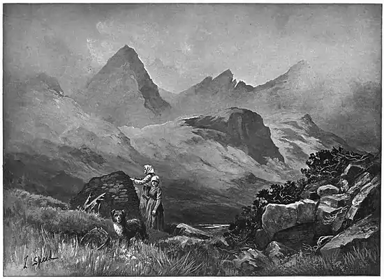 At Talisker Johnson made the acquaintance of young Macleane of Col, that amiable man whose death by drowning the following year he so much lamented. Under his guidance, taking leave of their kind hosts, they rode across the island to Sconser, on the coast opposite to Raasay. Of this part of their journey they tell us next to nothing, though they passed through the wildest scenery. For the first two or three miles their path wound up a valley that is not unworthy of the most delightful parts of Cumberland. It is altogether free from the utter desolation which casts a gloom over so much of Skye. The sloping sides of the hills are covered with short grass and fragrant herbs. All about in summer time are dotted the sheep and lambs, answering each other with their bleats. When we travelled along this way we passed a band of five-and-twenty shearers who had been hard at work for many days. The farm of Talisker keeps a winter stock of between five and six thousand Cheviot sheep, and the clipping takes a long time. Dropping into the valley on the other side of the hills the road leads beyond the head of Loch Harport across the island to Sligachan, where amidst gloomy waste now stands a comfortable hotel. In the little garden which surrounds it is the only trace of cultivation to be anywhere seen. It would have seemed impossible to add anything to the dreariness of the scenery; nevertheless something has been added by the long line of gaunt telegraph posts which stretches across the moor. Perhaps at this spot stood the little hut where our travellers made a short halt, as they watched an old woman grinding at the quern. With one hand she rapidly turned round the uppermost of two mill-stones, while with the other she poured in the corn through a hole pierced through it. A ride of a few more miles brought the party, through the gloom of evening, to Sconser, where they dined at the little inn.