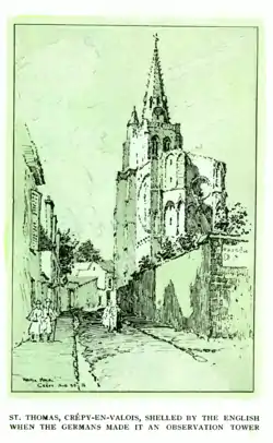 A few minutes later the Illustrator was sketching the finally discovered tower of St. Thomas—for so the object of our search was named. It had been shelled by the English while the Germans were making observations from it, as they bore on toward Paris. We thought it of interest. Our contemplation of it was shortly interrupted by the village constable, escorted thither by an official of the Army, who asked for our credentials. He; was a nervous little man, but with, I felt sure, an allegiance to duty which would result in a pointing to the laissez-passer and a cold asking, "Why Crépy?"