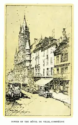 We reached Compiègne late. The journey was ten miles from Crépy by road, and we had been three hours en route, but one does not complain now in France. One whining stays at home. It was dark, and Compiègne was black as the pit, and there were no cabs. No, there was one cab proudly engaged. We discovered it by the headlight of a cart on which a crowd of officers were climbing. As we had pressed toward the gate—the air white with permits, for even a soldier carries his pass—an officer and I nodded to each other understandingly, for both of us were impeded by a dog and many tickets. I visibly admired his poodle, and as a reward he sang out from his high seat on the cart telling the driver of the solitary cab, if he was not waiting for old ladies, he must drive me also. But he was waiting for old ladies, so it was arranged that he would carry up the crafty kit bag, and we would join the long black line of pedestrians. "Bonne chance!" I called after the young officer and the dusky poodle. "Merci-i-i!" came the answer out of the gloom.