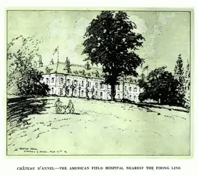 An army car, gray paint and white letters, was sent to us by Doctor Carrel to take us on to Château d'Annel, which, I believe, is the only field hospital under the American flag. The men are taken here directly from the front, often with only such bandaging as the stretcher-bearers can manage. It is very beautiful—the château—with a great tree in front which Napoleon planted, and a charming salon such as Napoleon would have enjoyed In company with his court, save that he might have been discommoded by the stack of "cradles" for shattered arms and legs which bravely ornamented one corner.