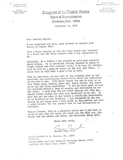When he came home, he was full of the training that he had received, and particularly enthusiastic about the dedication of the men he met. I'll never forget the way he kept us up that first night telling about Sgt. Henry Onacki, who apparently was his first instructor. It did my my heart good to hear him describe Onacki's love of country and dedication to the Air Force. I know that the Air Force through men like Sgt. Onacki helped awaken the very best instincts in my son. In this day and age when it has become a little bit fashionable to be critical of the military, I was delighted to see him return to our house with a real pride in the service and with a great respect for the leaders that he had encountered at Lackland.