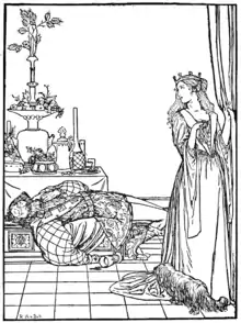 into his daughter's chamber and talked with her; but she said, "Let me try first if I cannot beat them some way or another." So she thought of a cunning scheme to overreach them; and dressing herself out as a poor girl, with a basket on her arm, she set out by night with her maid, and went into the enemy's camp, as if she wanted to sell trinkets.
