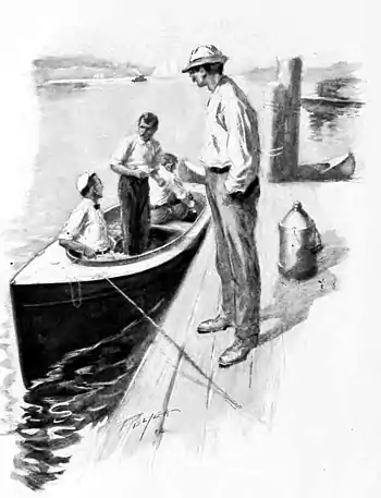But inquiry solved the matter for them. Gasolene could be bought at the next wharf above and the cost of it was only about twenty cents a gallon. Roy stuck his head through the little door under the forward decking and reported that the tank, according to his belief, would hold only some ten gallons. Dick sighed with relief. One of the freight-handlers took a great interest in them and their boat and proved invaluable, producing a rope with which to tie the boat up to the wharf, giving them the address of a man who could make flags and poles to occupy the fascinating sockets and lending practical assistance when, presently, they started to get the engine to running.