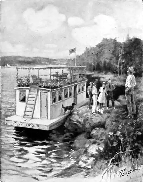 The windows were curtained with white dimity and through one of the doors, which stood partly open, they saw an engine. (“Gasolene,” murmured Dick knowingly.) On the hull at the bow was painted the name in bold black letters: Jolly Roger; and above, from a pole at the forward end of the roof-deck was a white flag which, when the little breeze spread its folds, displayed the gruesome skull-and-cross-bones in black!