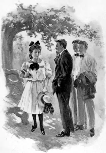 At the present moment, in spite of the cool white waist and skirt which she wore, she looked far from comfortable. Her low tan shoes were covered with the dust—for Silver Cove was a full mile distant, and there had been no rain for over a fortnight—her face was very red and her hair, usually decently well-behaved, had lost most of its waviness, and was straggling around her flushed face and around her neck in straight, damp strands. She had been hurrying as she had crossed the athletic field, and had turned the corner of the gymnasium, but at sight of the three boys coming to meet her her pace slackened and an expression of disappointment came into her face.