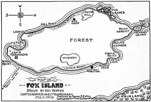 FOX ISLAND lies on the Ferry Hill side of the river some two hundred yards from shore and about a quarter of a mile above the school landing. It is fairly high, contains very nearly two acres, and is beautifully wooded. It is about one third as wide as it is long, and the shores, the inner shore especially, are full of tiny coves and promontories. There are two excellent beaches of white sand and nice round pebbles. Inner Beach, because of its more gradual slope, being the favorite bathing place. At the up-stream end of the beach a great granite boulder, worn round and smooth by water and weather, juts into the river, and forms an excellent place on which to lie in the sun and dry off without the aid of towels.