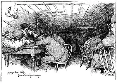 As "sitters" they occasionally find a job in the saloons about Chatham and Pearl Streets on cold winter nights, when the hallway is not practicable, that enables them to pick up a charity drink now and then and a bite of an infrequent sandwich. The barkeeper permits them to sit about the stove and by shivering invite the sympathy of transient customers. The dodge works well, especially about Christmas and election time, and the sitters are able to keep comfortably filled up to the advantage of their host. But to look thoroughly miserable they must keep awake. A tramp placidly dozing at the fire would not be an object of sympathy. To make sure that they do keep awake, the wily bartender makes them sit constantly swinging one foot like the pendulum of a clock. When it stops the slothful "sitter" is roused with a kick and "fired out." It is said by those who profess to know that habit has come to the rescue of oversleepy tramps and that the old rounders can swing hand or foot in their sleep without betraying themselves. In some saloons "sitters" are let in at these seasons in fresh batches every hour.