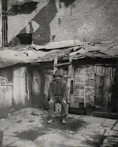 On one of my visits to "the Bend" I came across a particularly ragged and disreputable tramp, who sat smoking his pipe on the rung of a ladder with such evident philosophic contentment in the busy labor of a score of rag-pickers all about him, that I bade him sit for a picture, offering him ten cents for the job. He accepted the offer with hardly a nod, and sat patiently watching me from his perch until I got ready for work. Then he took the pipe out of his mouth and put it in his pocket, calmly declaring that it was not included in the contract, and that it was worth a quarter to have it go in the picture. The pipe, by the way, was of clay, and of the two-for-a-cent kind. But I had to give in. The man, scarce ten seconds employed at honest labor, even at sitting down, at which he was an undoubted expert, had gone on strike. He knew his rights and the value of "work," and was not to be cheated out of either.