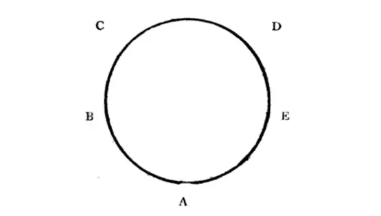 We will suppose that five players are taking part, whom we may distinguish as A, B, C, D and E; that they are seated in the order indicated in the diagram, and that A is the dealer. The deal passes from A to B, and so on. B is in such case the Age, and has put up, by way of ante a single counter.[36] Each player looks at his cards, whose value depends upon his possession of certain combinations, ranking in proportion to the rarity of their occurrence. C is the first to declare. If his cards are so bad that he has no hope of winning, he may "pass," i.e. go out of the game altogether for that hand. In such case, he throws his cards, face downwards, in front of the Age, who will in due course be the next dealer. If, on the other hand, C thinks his cards worth playing on, he "goes in," i.e. he puts in the pool double the amount staked by the Age. D, E and A in rotation do the same, either "passing" and throwing up their cards, or "going in" and placing in the pool a like amount to that just contributed by C. When the turn of B (the Age) is reached, he has to make a similar decision, and, if he decide to go in, must put in the pool a like amount to that which he first staked, thereby placing himself on an equal footing with the other players.[37]