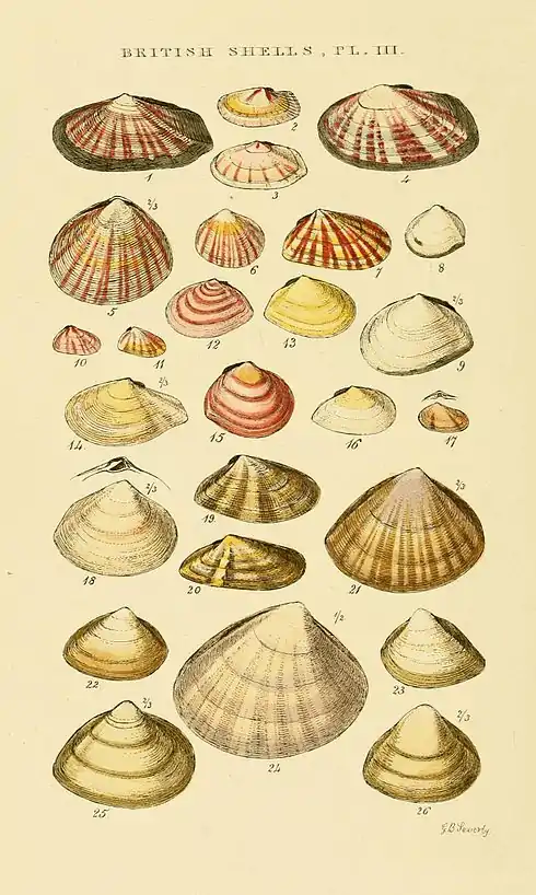 Pl. III. Psammobia 1, 3, 4. Tellina 5, 6, 7, 9, as ovata, 15, as Balthica, 16. Scrobicularia 18, as Trigonella plana. Donax 19, as vittatus. Mactra 20, 21, 22, as ovalis, 23, 25, 26.
