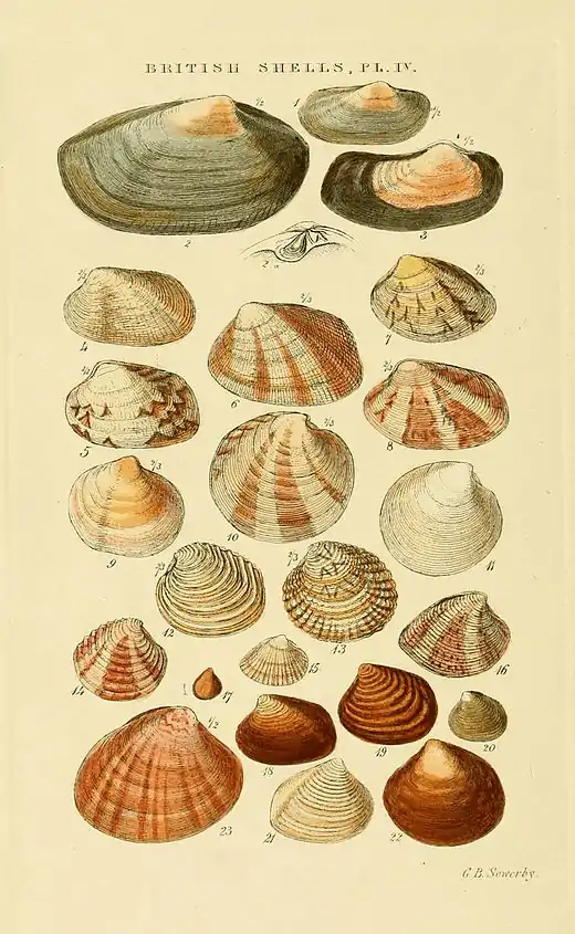 Fig. 1-3 also represent genera of Cyprinidæ. They have no bend in the palleal impression. Cardium, or "Cockle," 4-13, presents a peculiarity in the foot, which is large and bent, and enables the animal to leap in a very lively manner. The family of Lucinidæ occupy the remaining figures. Lucina has a curious tongue-shaped doubling of the pallial impression.