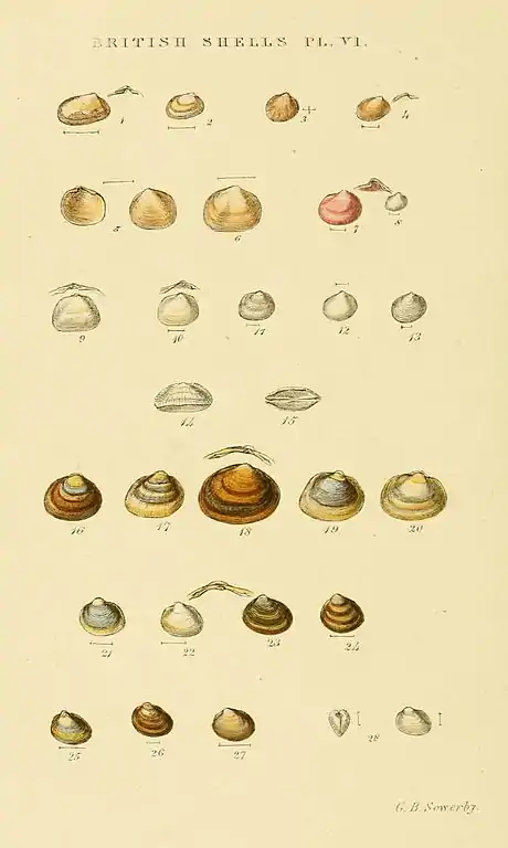 The Kelliadæ, 1-15, are marine, while the Cycladidæ, completing the Plate, are fresh-water bivalves, and may be found in many ponds and rivers.