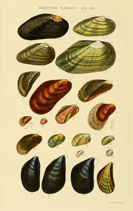 Of the Unionidæ, or "Fresh-water Mussels," Unio, 1-3, has teeth on the hinge, and Anodon, 4, has not: it is a thin shell. The foot of these molluscs is very large, and is used in cutting the animal's way through the mud in which it burrows. Of the marine, or true Mussels, Modiola, 6-9, and Crenella, 12-17, have a portion of the shell reaching beyond the point or apex, which in Mytilus is terminal, 18-21. Dreissina, 5, is shaped like Mytilus, but lives in fresh-water docks. The Mytilidæ attach themselves by means of horny threads spun from the foot, and called a "byssus."