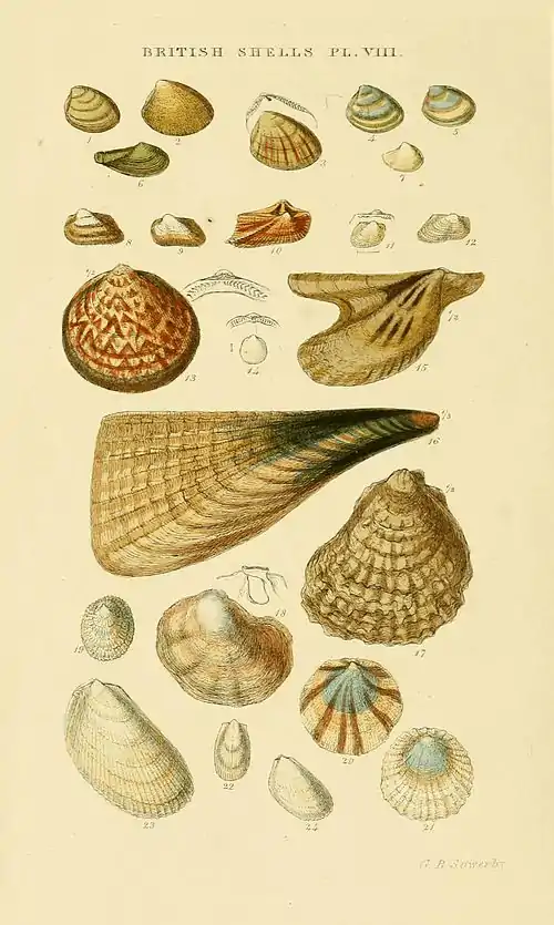 Contains the shells of our Pectens, or Scallops, 1-16. The animals swim like Lima, as above, and also spin a byssus.