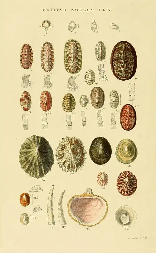 Pl. X. Chiton 7, as fascicularis. Patella 18. Acme 23. Propilidium, as Tectura, 24. Dentalium 26, 27. Capulus 28. Calyptræa 29.