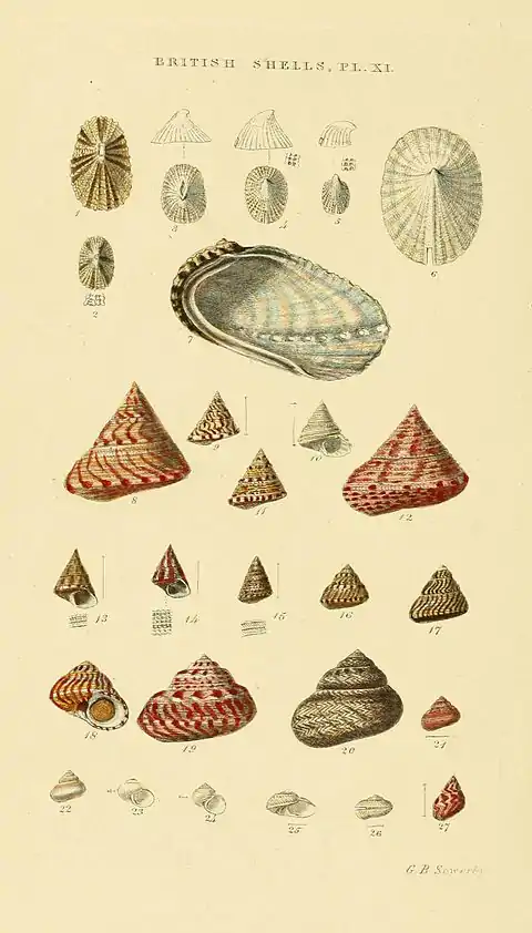 This Plate commences with other forms of the Limpet tribe, Fissurella, 1, 2, with a hole at the top; Puncturella, 3, with a fissure near the top; and Emarginula, 4-6, with a slit at the margin. Haliotis, 7, or pearly "Ear-shell," leads to the Trochidæ, or "Tops," 8-27.