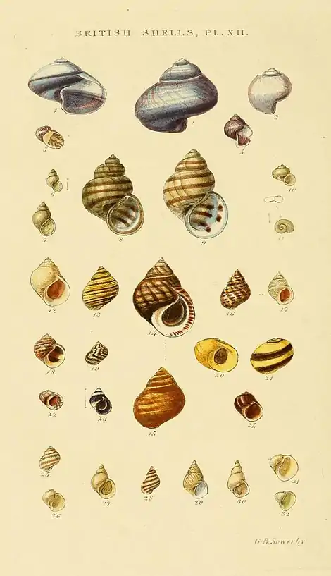 Neritina, 5, and the Paludinidæ, 8-11, live in fresh-water. The animal of Paludina is sprinkled all over with bright, golden specks. The Littorinæ, or "Winkles," 12-24, are marine, and frequent the shore among seaweeds. Lacuna, 25-32, belongs to the same family.