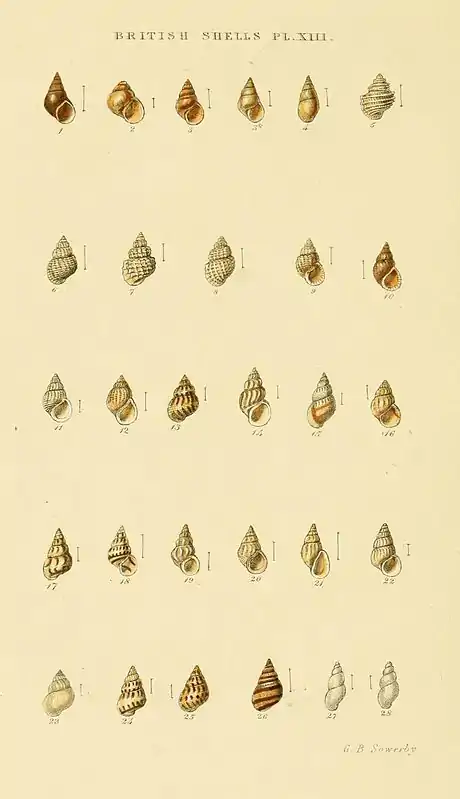 Pl. XIII. Rissoa 3*, as Paludestrina subumbilicata, 7, 11?, 13?, 15, 23, 27.