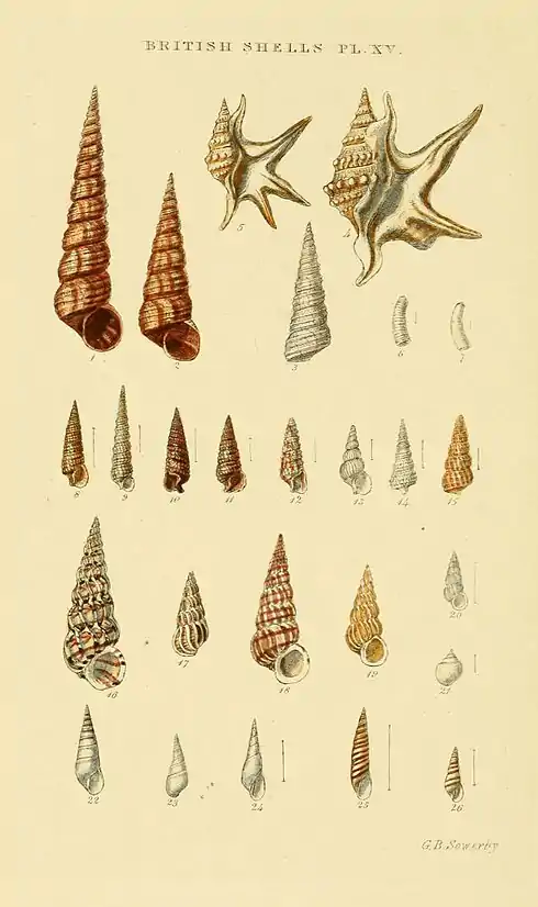 Pl. XV. Turritella 2. Aporrhais 4. Cæcum 6, 7. Cerithium 9, 10. Cerithiopsis, as Cerithium, 11. Scalaria 17, 19, 20. Eulima 22, 25.