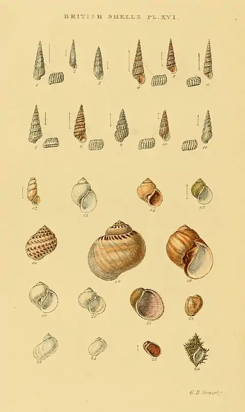 Pl. XVI. Chemnitzia 1, 2, as similis, 4, 8. Natica 13, 17, as Catena, 19, as Grœnlandica. Velutina 21. Trichotropis 26.