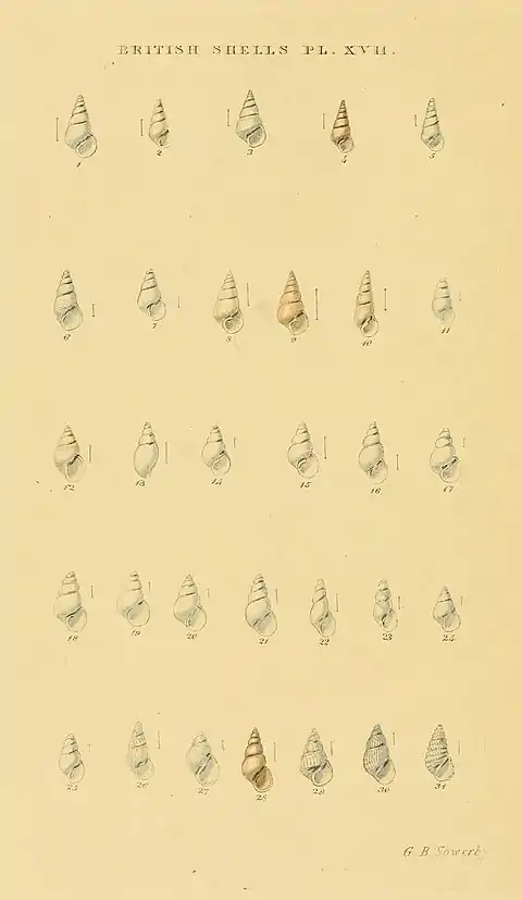 Pl. XIV. Rissoa 2, 9, as Chemnitzia. Aclis 24, as Alvania ascaris, 25, as Chemnitzia n.