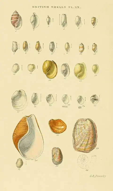 After Tornatella, 1, and Ovula, 2, 3, come Bullidæ, 4-27, including several genera differing remarkably in the shape and disposition of the lobes of their mantles, which in some instances, as in Philine, 20-25, cover the shell. The stomach of Scapander, 26, 27, is a remarkable kind of mill, composed of two bones, between which the food is ground. The shells of Aplysia, 28, and Pleurotranchus, 29, 30, are quite internal. Spirula, 31, belonging to the Cephalopodous or Cuttlefish tribe, is only introduced doubtfully, as there is no proof of the species living in our seas.