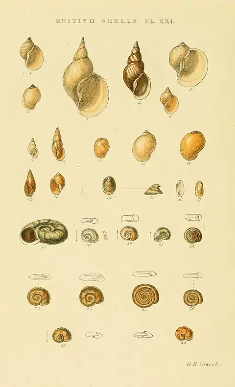 Pl. XXI. Limnæa 1, 4, 7, 11. Planorbis 18, 24, as complanatus, and in the upper fresh-water formation, all except 9, 11.