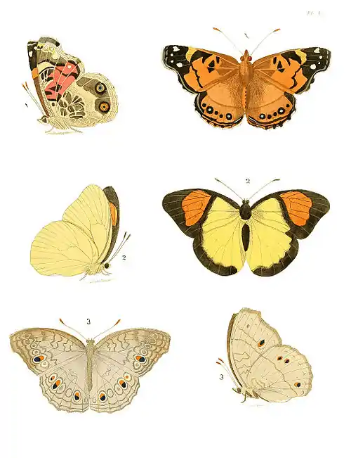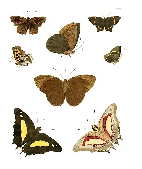 - ↑ The original title of this work, Vol. I., was "Illustrations of Natural History, wherein are exhibited upwards of two hundred and forty figures of Exotic Insects, according to their different genera, very few of which have hitherto been figured by any author, being engraved and coloured from nature, with the greatest accuracy, and under the author's own inspection; on fifty copper-plates; with a particular description of each Insect, interspersed with remarks and reflections on the nature and properties of many of them, by D. Drury, 1770." The second volume containing upwards of two hundred and twenty figures, on fifty copper-plates, appeared in 1773; and the third containing upwards of two hundred figures, also on fifty plates, was not published until 1782. The majority of the plates were drawn and engraved by the celebrated Moses Harris, but some of the plates in the last volume were by a different hand.