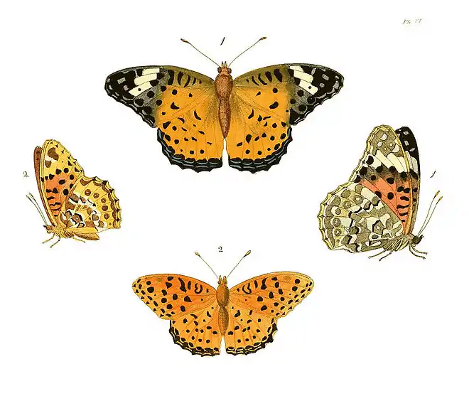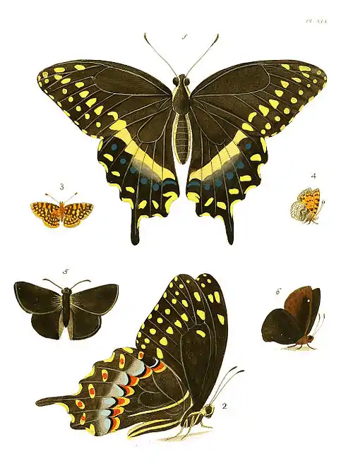 - ↑ Sir J. E. Smith states that the Linnæan cabinet does not contain a specimen of this insect, nor of the Ilioneus of "the Insects of Georgia," pl. 2, one of the figures of which was considered by Mr. Jones, the celebrated lepidopterist, to be the Linnæan Troilus. Nevertheless, on the authority of the Banksian cabinet labelled (from recollection alone) by Fabricius, Sir J. E. Smith gave the Asterias under the name of Troilus, and the true Troilus as a new species.