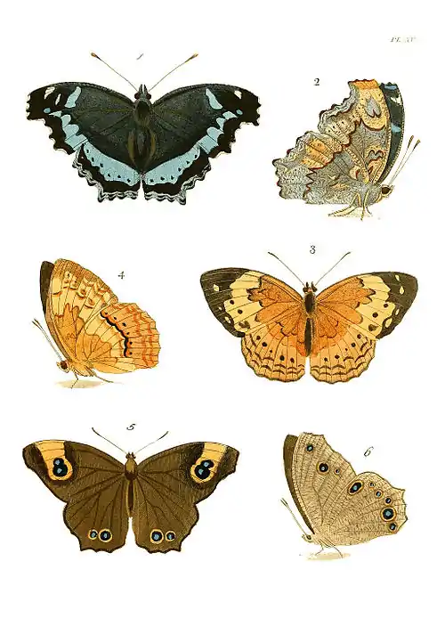 - ↑ The name of this African species has not been recorded. The following additional observations by Mr. Smeathman will be serviceable in enabling us to obtain an idea of the treasures which, even yet, European entomologists may expect to receive from this but little investigated quarter of the globe. "The whole country of Africa, within the tropics, is one immense forest, except where the sandy plains are too unsettled to afford a proper footing for vegetation. Wherever any inhabitants settle, they make plantations by cutting down the woods and burning them to fertilize the ground, and never sow two years together on the same spot, but let the trees grow up again for two or three years, by way of fallow, before they attempt to get another crop from it. It is these spots, which Smeathman calls recent plantations, which afford the greatest variety of insects and the easiest obtained. In the second and third year they become impassable to human feet."
