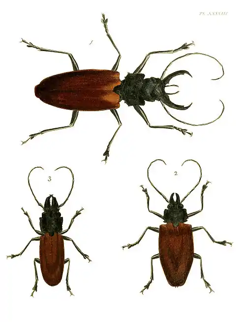 - ↑ Since this was written, I have been favoured by Mr. Mac Leay with an inspection of his magnificent collection, which possesses a Goliathus, nearly resembling the insect here figured, and which that gentleman considers as a variety of this. It is, however, considerably smaller, and the horns of the head are not so much developed.