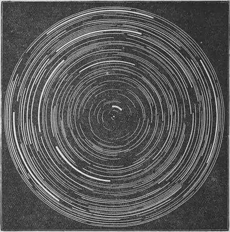 In this particular case the clockwork which is ordinarily employed to keep the stars acting at the same point of the plate was dispensed with. The telescope, in fact, remained fixed while the heavens rotated in obedience to the diurnal motion. Under these circumstances each star, as minute after minute passed by, produced an image on a different part of the plate; the consequence of which was that, when the picture was developed, the record which the star was found to have left was a long trail instead of a sharply defined point. As each star appeared to describe a circle in the sky around the Pole, and as, in the vicinity of the Pole, these circles were small enough to be included in the plate, this polar photograph exhibited a striking spectacle. It displayed a large number of concentric circles, or rather, I should say, of portions of circles, for the exposures having lasted for about four hours, about one-sixth of each circumference was completed during that time. The effect thus produced was that of a number of circular arcs of varying sizes, and of different degrees of brightness. A representation of this photograph is given in Fig. 8.