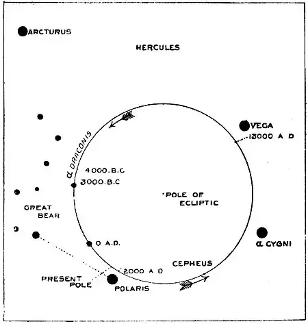 Suppose that a photograph, like that which I have been describing, were to be taken at intervals of a century, it would be found that the centre of the system of circles, that is to say, the veritable Pole itself, was gradually changing on the heavens. I do not by this mean that the stars themselves would be found to have shifted their places relatively to each other. No doubt there is some effect of this kind, but it is an insignificant one, and need not at present concern us. The essential point to be noticed is, that the stars which happen to lie in the vicinity of the Pole would have a changed relation to the Pole in consequence of the fact that this latter point is itself in incessant movement. At the present time the Pole is advancing in such a direction that it is getting nearer to the Pole Star, so that the actual circle which the Pole Star is describing is becoming less and less. The time will come when the circle which this star performs will have reached its lowest dimensions, but the Pole will still be moving on its way, and then, of course, the dimensions of the circle traversed by the Pole Star will undergo a corresponding increase. As hundreds of years, and thousands of years roll by the Pole will retreat further and further from the Pole Star, so that in the course of a period as far in the future as the foundation of Rome was far in the past, the Pole will be no longer sufficiently near the Pole Star to enable the latter to render to astronomers the peculiar services which it does at present.
