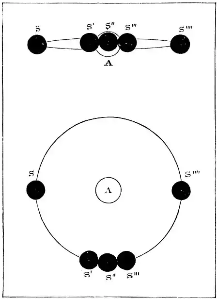 For the next advance in this remarkable investigation we have to depend, not on our instruments, but on the laws of mechanics. We have spoken of Algol as moving to and fro, but it is necessary to observe that it is impossible for a star to run along a straight line for a certain distance, stop, turn back, again retrace its movement, stop, and again return. Such movement is simply forbidden by the laws of motion. We can, however, easily ascertain that there is a type of motion possible for Algol which shall be compatible with the results of the spectroscopic research and also be permitted by the laws of motion. There is no objection to the supposition that Algol is moving in a path which is nearly, if not exactly, a circle. In this case it would only be moving as does the moon, or the earth, or any of the other planets. It will be only necessary to suppose that the plane of the orbit of Algol is directed nearly edgewise towards us. During the description of one semicircle Algol will be coming towards us, while, during the other semicircle it will be going from us, and thus the observed facts of the movement are reconciled with the laws of motion. Of course, this involves a certain periodic shift in the position of Algol in the heavens. It must, for instance, when moving most rapidly from us be at a distance equal to the diameter of the circle from the position which it has when moving most rapidly towards us. This is true, but the extent of the shift of place is far too small to be visible to our instruments. In fact, it can be shown that the visual size of the circle in which Algol revolves could hardly be larger than is that which the rim of a three-penny bit would appear to have if viewed from a situation five hundred miles away. It is one of the extraordinary characteristics of the spectroscopic method that it renders such an orbital movement perceptible.
