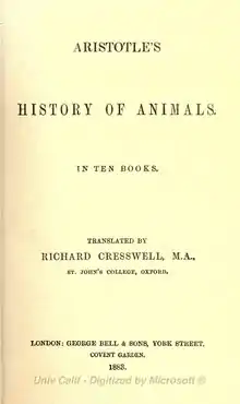 Analytical Table of Contents. Book I.—The work commences with a general review of the animal kingdom, and several suggestions for a natural arrangement of animals in groups, according to their external form or their mode of life, a comparison of animals among themselves, and a description of some of their habits. Aristotle then introduces the human form, the best known to man, as the standard of comparison to which he refers the rest of the animal kingdom. The concluding chapters of this book are occupied with a description of the several parts of the human body, both internal and external. Book II.—In the second book the different parts of animals are described. The animals are arranged in various groups, viviparous and oviparous quadrupeds, fish, serpents, birds. The only animals described are those with red blood: the description of the rest being reserved for the fourth book. Their internal organs are also described; and in the course of the book a few animals, as the ape, elephant, and chameleon, are especially noticed. Book III.—The third book commences with a description of the internal organs, beginning with the generative system. A considerable portion of the book is devoted to the course of the veins; and Aristotle quotes from other writers, as well as states the result of his own observations. He then describes the nature of other constituent parts of the body, sinews, fibres, bone, marrow, cartilage, nails, hoofs, claws, horns, and beaks of birds, hair, scales, membranes, flesh, fat, blood, marrow, milk, and the spermatic fluid. Book IV.—Animals without blood, and first, the cephalopods, are described; then the crustaceans, testacea, echinidæ, ascidians, actiniæ, hermit crabs, insects. In the eighth chapter the organs of sense are considered, and afterwards, the voice, sleep, age, and differences of the sexes in animals are described. Book V.—In the former books animals are for the most part described with reference to their several parts. In the fifth book they are treated as entire, and especially with regard to their mode of reproduction. First of all, our author treats of spontaneous reproduction, and then of those animals which spring from a union of the sexes; and from this he proceeds to some detail with respect to different groups of animals, testacea, crustacea, insects. The book concludes with a long description of bees and their habits. Book VI.—In this book the same subject is continued through the several classes of birds, fish, and quadrupeds. This account of the reproduction of animals includes also the consideration of the seasons, climates, and ages of animals, and how far these influence their reproduction. Book VII.—The seventh book is almost entirely devoted to the consideration of the reproduction of man, and an account of man from his birth to his death. This book ends abruptly, and is probably imperfect. Book VIII.—In the eighth book Aristotle passes on to the most interesting part of his work, the character and habits of the whole animal world, as it was known to him. The amount of detail which he has collected and arranged on this subject is most interesting. He treats, first of all, of the food of animals, of their migrations, their health and diseases, and the influence of climate upon them. Book IX.—The subject of the eighth book is continued, with an account of the relations in which animals stand to each other, and especially the friendship and hostility of different species; and these are for the most part referred to the nature of their food, and their mode of procuring it. The notices of fish are not so numerous as those of other groups: this would necessarily arise from the difficulty of observation. At the conclusion of the book, an essay on bees and their congeners is given at considerable length. Book X.—This book, in all probability erroneously ascribed to Aristotle, is occupied with a treatise on the causes of barrenness in the human species. It appears to be rather a continuation of the seventh book, which ends abruptly; but it is well placed at the end, as no genuine work of our author. |