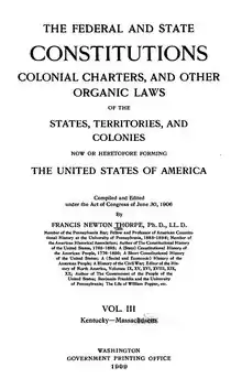 Title The Federal and State Constitutions, Colonial Charters, and Other Organic Laws of the States, Territories, and Colonies Now or Heretofore Forming the United States of America, Vol. III: Kentucky—Massachusetts