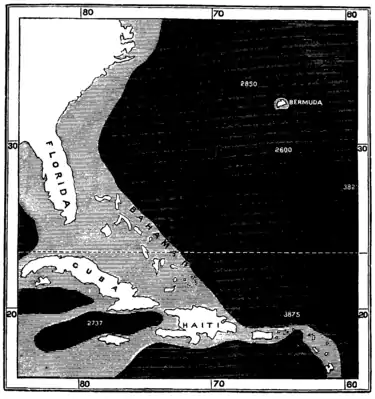 The Bermudas are a small group of low islands formed of coral, and blown coral-sand consolidated into rock. They are situated in 32° N. Lat., about 700 miles from North Carolina, and somewhat farther from the Bahama Islands, and are thus rather more favourably placed for receiving immigrants from America and its islands than the Azores are with respect to Europe. There are about 100 islands and islets in all, but their total area does not exceed fifty square miles. They are surrounded by reefs, some at a distance of thirty miles from the main group; and the discovery of a layer of earth with remains of cedar-trees forty-eight feet below the present high-water mark shows that the islands have once been more extensive and probably included the whole area now occupied by shoals and reefs.[106] Immediately beyond these reefs, however, extends a very deep ocean, while about 450 miles distant in a south-east direction, the deepest part of the North Atlantic is reached, where soundings of 3,825 and 3,875 fathoms have been obtained. It is clear therefore that these islands are typically oceanic.