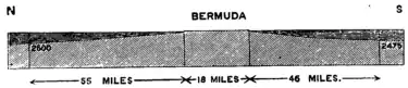 Soundings were taken by the Challenger in four different directions around Bermuda, and always showed a rapid deepening of the sea to about 2,500 fathoms. This was so remarkable, that in his reports to the Admiralty, Captain Nares spoke of Bermuda as "a solitary peak rising abruptly from a base only 120 miles in diameter;" and in another place as "an isolated peak rising abruptly from a very small base." These expressions show that Bermuda is looked upon as a typical example of an "oceanic peak"; and on examining the series of official reports of the Challenger soundings, I can find no similar case, although some coasts, both of continents and islands, descend more abruptly. In order to show, therefore, what is the real character of this peak, I have drawn a section of it on a true scale from the soundings taken in a north and south direction where the descent is steepest. It will be seen that the slope is on both sides very easy, being 1 in 16 on the south, and 1 in 19 on the north. The portion nearest the islands will slope more rapidly, perhaps reaching in places 1 in 10; but even this is not steeper than many country roads in hilly countries, while the remainder would be a hardly perceptible slope. Although generally very low, some parts of these islands rise to 250 feet above the sea-level, consisting of various kinds of limestone rock, sometimes soft and friable, but often very hard and even crystalline. It consists of beds which sometimes dip as much as 30°, and which also show great contortions, so that at first sight the islands appear to exhibit on a small scale the phenomena of a disturbed Palæozoic district. It has however long been known that these rocks are all due to the wind, which blows up the fine calcareous sand, the product of the disintegration of coral, shells, serpulæ, and other organisms, forming sand-hills forty and fifty feet high, which move gradually along, overwhelming the lower tracts of land behind them. These are consolidated by the percolation of rain-water, which dissolves some of the lime from the more porous tracts and deposits it lower down, filling every fissure with stalagmite.